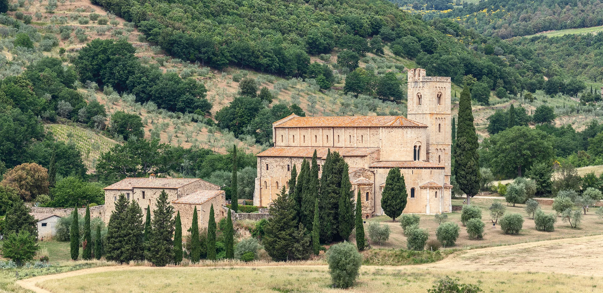 Anschließend besuchen Sie die Benediktiner-Abtei Abbazia di Sant'Antimo, die inmitten von Wiesen und Olivengärten liegt. Die Kirche ist ein Kleinod romanischer Baukunst, und Sie können die Kunstschätze bewundern. Nach der Besichtigung stärken Sie sich mit einem kleinen Imbiss und einer Weinverkostung in den Weinbergen des Brunello.
